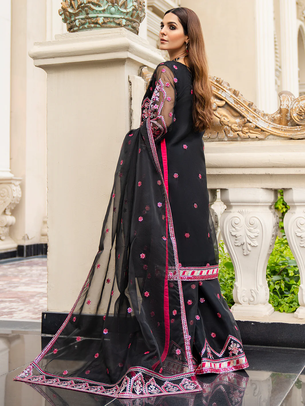 Adelina luxury collection by Shah jahan Ready to wear. Introducing the Shahjahan black Ensemble, A masterpiece that seamlessly marries tradition and contemporary style. This meticulously crafted outfit, featuring the renowned Shah jahan brand, is a testament to luxury, elegance, and the timeless artistry of ethnic wear. Shah jahan serves as the canvas for opulent embroidery and adda work, showcasing the brand's commitment to exquisite craftsmanship. The intricate detailing, inspired by cultural motifs, is a testament to the brand's dedication to preserving traditional design while adding a touch of modern sophistication. sharara complementing the shirt, the Shahjahan sharara is a vision of flared grace, adorned with embroidery and adda work that mirrors the elegance of the shirt. The wide-legged silhouette is designed to enhance movement and provide a regal flair to the ensemble.