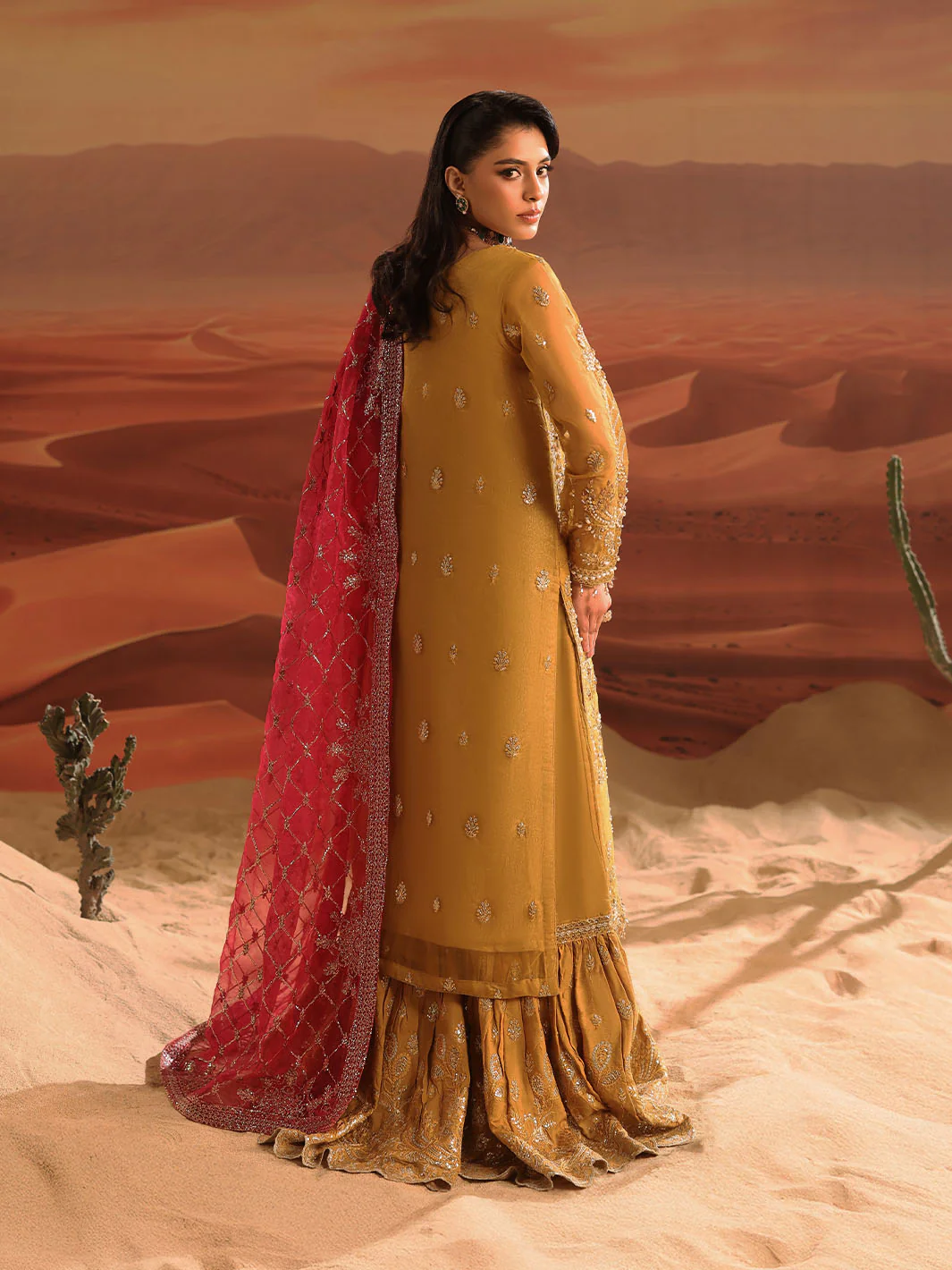 This out fit by LINA BY shahjahan is a vibrant nustard yellow formal fress with intricate silver embalishment and embroidery on the front panel ,sleevs and neckline. The dress has fitted bodice and a flaired gharara style.it is paired with red organza dopatta and jacquard gharara
